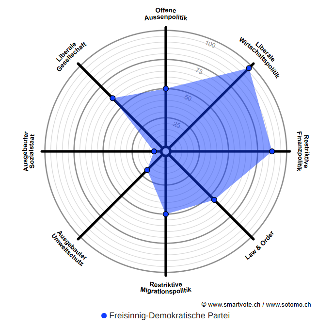 Die Aussenpolitik ist Interessenpolitik zur Sicherung von Wohlstand, Neutralität und Sicherheit in unserem Land. Unsere Unternehmen müssen Zugang zu neuen Märkten erhalten und ihre bestehenden Positionen festigen können. Wichtig ist zudem die Versorgung mit Rohstoffen und Energie. Zentral für unsere Arbeitsplätze ist der Zugang zum Binnenmarkt der Europäischen Union als wichtigster Kunde unserer Exportwirtschaft. Die FDP setzte sich als einzige Partei immer ohne Wenn und Aber für den bilateralen Weg mit der EU ein, lehnt aber sowohl einen EU- oder EWR-Beitritt, als auch eine Abschottungspolitik ab. Zusätzlich setzt sich die FDP für neue Freihandelsverträge mit Drittstaaten in aufstrebenden Wirtschaftsregionen ein. Die guten Dienste und die Vermittlerrolle der Schweiz in Konflikten müssen gewahrt und, wo notwendig, gestärkt werden.